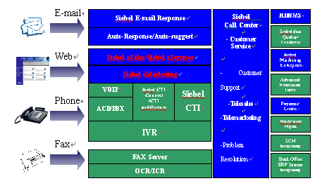 Siebel eService 、Siebel eMail Response能夠使企業(yè)通過Web和Email管理與實現(xiàn)其服務(wù)處理流程,為客戶提供了自助服務(wù)和有助服務(wù)的選擇。該應(yīng)用系統(tǒng)可以很方便地為客戶創(chuàng)建新的服務(wù)請求,輸入服務(wù)細節(jié),跟蹤服務(wù)的執(zhí)行情況和過程,并可以實時監(jiān)控服務(wù)的執(zhí)行結(jié)果。Siebel eService提供了人性化的個人主頁,對呼叫中心進行Web協(xié)同的支持,"call me now"的支持,以及支持全文本檢索系統(tǒng)等功能,如圖五所示。 通過在線訪問Siebel歷史數(shù)據(jù)庫,客戶可以自助地獲取問題的解決方案或通過網(wǎng)絡(luò)互動技術(shù),與在線代理員進行網(wǎng)絡(luò)協(xié)同、文本聊天、共享畫板,進一步得到更加個性化的服務(wù)。通過使用Siebel eSmartScript超強的客戶檔案信息分析管理應(yīng)用,可以為客戶提供附加powerpoint方案,word文檔的自動生成管理能力。 Siebel eService集成了客戶滿意度調(diào)查模塊,可以實現(xiàn)在線的客戶滿意度調(diào)查,通過其企業(yè)可以了解客戶的滿意程度,以及當前客戶所關(guān)心的問題或所感興趣的產(chǎn)品。Siebel eMail Response提供了增強的Email相應(yīng)標準模板,可以使客服中心更加有效地通過Email與客戶進行交流。