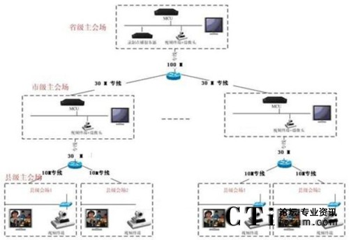 本方案整體采用基于IP網(wǎng)絡(luò),在省、市中心機房放置MCU,通過網(wǎng)線接入核心交換網(wǎng)絡(luò);在會議室放置視頻終端,通過郵政專網(wǎng)進行互聯(lián)。一級系統(tǒng)以省中心會議室為主會場,下屬各市會議室為分會場組成邏輯星形拓撲結(jié)構(gòu);二級系統(tǒng)以市州郵政局會議室為主會場,下屬各區(qū)縣郵政局會議室為分會場。兩級系統(tǒng)通過MCU級聯(lián)互通,形成一個樹形的拓撲結(jié)構(gòu)。系統(tǒng)主要由全視頻會議管理系統(tǒng)、純硬件MCU、純硬件1080P高清會議終端等組成,采用MCU為中心的星形結(jié)構(gòu)建立一個數(shù)字連接的、專業(yè)的視頻會議系統(tǒng)。視頻會議系統(tǒng)可由省郵政廳視頻會議中心控制,任意切換參會市、州(分中心)、縣、市、區(qū)(終端)的會議畫面。視頻會議系統(tǒng)可以指定任意參會單位發(fā)言并實現(xiàn)全省會場統(tǒng)一的畫面切換。視頻會議系統(tǒng)可實現(xiàn)省郵政局集中控制與管理,易于使用,能進行遠程管理、遠程維護、可降低維護成本。通過授權(quán),各級單位可自行組織、控制會議,方便各級單位的使用。
