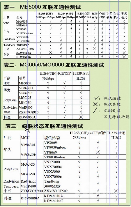 相比之下,視訊終端MG6050/MG6060的測試要簡單一些,有了前面的經(jīng)驗(yàn),我們將測試重點(diǎn)集中在H.264編碼的高清視頻和H.239雙流傳送方面。將MG6050/MG6060分別交由其它MCU管理,測試過程十分煩瑣。好在測試結(jié)果是出奇得好,兩臺視訊終端表現(xiàn)完全一致,僅有科達(dá)的KDV8000A在H.239雙流測試中出現(xiàn)兼容性問題,現(xiàn)象是傳送輔流時(shí)死機(jī)。