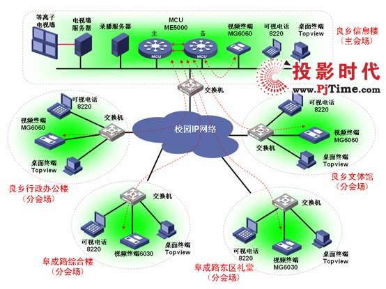 ME5000(配置32*768K)型MCU,在主會(huì)場及各分會(huì)場會(huì)議室共配置9臺高清會(huì)議室型會(huì)議終端(MG6060)和4臺標(biāo)清會(huì)議室終端(MG6030);同時(shí)學(xué)校領(lǐng)導(dǎo)桌面部署120部可視電話和12套桌面終端,具體視頻會(huì)議組網(wǎng)拓?fù)鋱D如下所示: