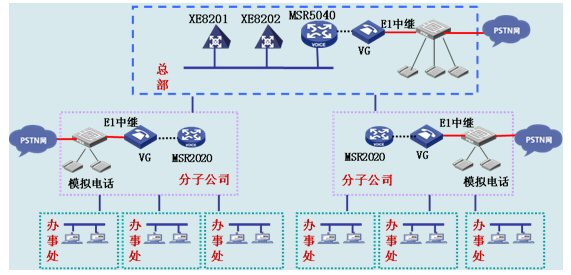 集團(tuán)總部和分子公司部署H3C公司的VG80-20作為語(yǔ)音網(wǎng)關(guān),VG 80-20提供2個(gè)E1語(yǔ)音接口用于接連接程控電話交換機(jī)PBX的E1中繼線,通過(guò)以太網(wǎng)口連接到IP網(wǎng)中。