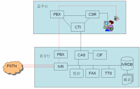 - 各分行采用IVR前置模式,通過PSTN直接接入到IVR服務(wù)器坐自動(dòng)語音服務(wù)。
