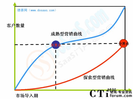 圖中分界點代表SaaS廠商進(jìn)入盈虧平衡點,即用戶續(xù)費已經(jīng)能夠保證企業(yè)正常運(yùn)營。目前大多數(shù)SaaS廠商目前都在探索SaaS營銷的方式方法,這種探索型的策略往往是基于以往的經(jīng)驗和傳統(tǒng)軟件的營銷策略進(jìn)行,沒有創(chuàng)新,沒有針對性。因此在市場導(dǎo)入期將會導(dǎo)致營銷周期長、營銷成本高,銷售業(yè)績差的局面出現(xiàn)。SaaS廠商可能都有這個經(jīng)歷,付費用戶從0到10要比從10到100難得多,成本也高得多。而對 SaaS廠商來說,最重要的就是快速開拓維持企業(yè)正常運(yùn)轉(zhuǎn)的客戶,在最短的時間內(nèi)提供企業(yè)運(yùn)轉(zhuǎn)的現(xiàn)金流,因為SaaS廠商的運(yùn)營成本已經(jīng)存在,如果前期銷售成本高、周期長,有可能廠商還沒有堅持到盈虧平衡點就已經(jīng)倒閉了。XTools副總經(jīng)理謝億民說:“我們XTools的五年,也花費了一兩年的時間自己去摸索SaaS的營銷之路,當(dāng)時沒有人知道SaaS到底是如何做營銷的。一旦知道如何營銷,就增長迅速,XTools目前已經(jīng)突破瓶頸,實現(xiàn)快速增長。”