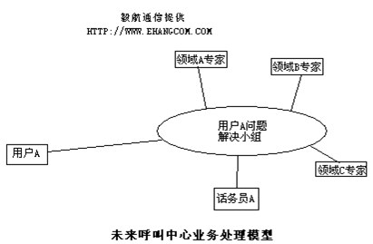 在未來呼叫中心里面,話務(wù)員的技能主要就是協(xié)調(diào)專家組和用戶的需求間的關(guān)系,此時話務(wù)員不需要很多技能,她變成一個小組工作組織者。而一個個領(lǐng)域?qū)<揖褪窃拕?wù)員的助手,她根據(jù)對用戶業(yè)務(wù)處理的情況,實(shí)時邀請相應(yīng)的專家加入問題解決小組。領(lǐng)域?qū)<野葱柽M(jìn)入和退出問題解決小組,此時客戶感覺始終如一的有個話務(wù)員在幫忙處理他的問題,而不是象現(xiàn)在的呼叫中心那樣,被踢皮球,每轉(zhuǎn)接一次,就得重復(fù)很多提供過的資料,這樣費(fèi)時重復(fù),還容易引起用戶怨言;甚至在被轉(zhuǎn)接的過程掉線了。在這個未來模型中,話務(wù)員的問題處理技能不是重要的,重要的是她的組織協(xié)調(diào)能力,因而對話務(wù)員的大量專業(yè)知識培訓(xùn)就變得不在必要,話務(wù)員變成了任何呼叫中心都通用的了,不再和企業(yè)業(yè)務(wù)緊密相關(guān)。減少無關(guān)要求,推動整個呼叫中心行業(yè)進(jìn)一步分工協(xié)作,整個呼叫中心服務(wù)成本也能急劇降下來,促使整個產(chǎn)業(yè)健康有序發(fā)展。