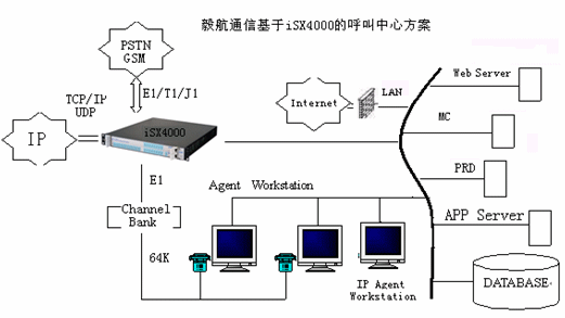 相對于現(xiàn)在的兩種主流呼叫中心方案,毅航通信基于iSX4000呼叫中心解決方案直接整合了Internet的接入。傳統(tǒng)由IVR完成的操作也可以通過Web頁面上的流程實(shí)現(xiàn),這樣用戶通過下拉菜單、簡單填寫、點(diǎn)擊按鈕等操作完成客戶識別、業(yè)務(wù)識別等操作,這些流程完成后,通過VoIP對呼叫中心呼入,由呼叫中心對呼入進(jìn)行受理,再按照相應(yīng)的原則分配到座席,座席再作相應(yīng)的應(yīng)答和處理,從而為客戶提供了一個通過Web站點(diǎn)直接進(jìn)入呼叫中心的途徑,把Internet所具有的豐富信息資源和強(qiáng)大的功能賦予呼叫中心,它向客戶提供一個可訪問的Web站點(diǎn),使得呼叫中心從“撥叫到交談(Dial to Talk)”發(fā)展到“點(diǎn)擊到交談(Click to Talk)”,通過Internet可以提供IP電話語音呼叫、Call Back、IP傳真、IM、E-mail等功能,擴(kuò)展了通信渠道,一方面用戶可以實(shí)現(xiàn)免費(fèi)接入到呼叫中心,另一方面企業(yè)能夠向更多的客戶提供優(yōu)質(zhì)、方便的服務(wù)資源,而且由于這些資源的價格相對傳統(tǒng)通信便宜,使企業(yè)為客戶提供全國、乃至于全球服務(wù)成為可能,提高了企業(yè)客戶服務(wù)水平,增強(qiáng)了企業(yè)競爭力。毅航通信統(tǒng)一呼叫中心解決方案系統(tǒng)結(jié)構(gòu)如圖所示: