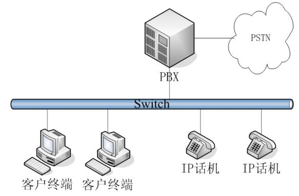 - 簡單網(wǎng)絡結構:一般適用于小型企業(yè)或企業(yè)內(nèi)某個部門的網(wǎng)絡結構。內(nèi)部通訊在一個網(wǎng)段內(nèi),外部通訊通過一臺PBX交換。