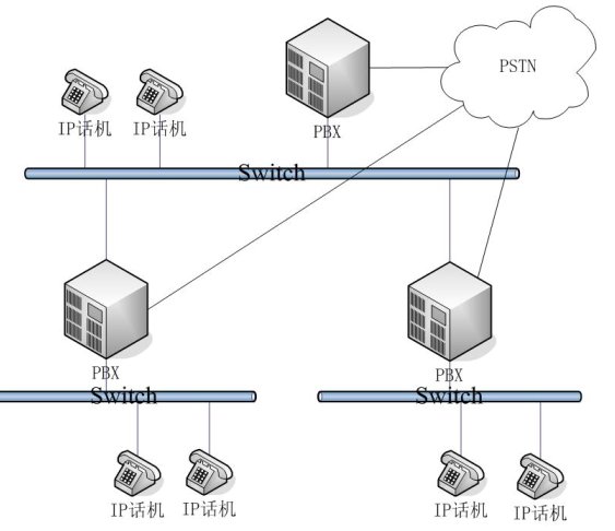- 普通網(wǎng)絡結構:適用用于中型企業(yè)。在不同地域有公司分部,各分部之間通訊需要通過PSTN,每個分部都有自己的PBX。相對于每個分部而言,采用的是簡單網(wǎng)絡結構。