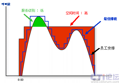 如果僅僅是工作量大,我想排班員還能夠忍受,更要命的是,排出的班表不能做到精確。要么人員太多,導(dǎo)致運(yùn)營成本上升;要么人員不夠,無法達(dá)到預(yù)期的服務(wù)目標(biāo)。以呼叫中心典型的雙峰曲線為例(如右圖),排班所追求的是人力安排和話務(wù)曲線的盡可能吻合(也就是圖中藍(lán)色的最佳排班線),達(dá)到在滿足服務(wù)水平的基礎(chǔ)上盡可能少的安排座席資源。而在手工排班中,由于大量的采用組排班,組中成員同時上下班、同時午餐,導(dǎo)致人力安排的靈活性降低,不能盡可能的去擬合話務(wù)曲線。此外,參考前面談到的影響人力安排的因素,手工排班中考慮了環(huán)境的影響,部分考慮了縮減,但座席技能因素考慮很少,基本認(rèn)為所有人員的技能熟練度一致,不可預(yù)見性縮減也沒有考慮進(jìn)去,導(dǎo)致最終會對服務(wù)水平造成負(fù)面影響。因此,手工排班是一種粗放型的排班方式,隨著運(yùn)營要求的提高,表現(xiàn)出一定的不適應(yīng)性。