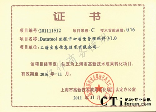 CTI論壇(ctiforum)12月7日消息(記者 張潔):2011年的最后一個月,寶東公司傳來又一好消息,公司的開發(fā)團(tuán)隊自主開發(fā)研制的針對呼叫中心客服的質(zhì)檢軟件“Datatool 客服中心質(zhì)量管理軟件(簡稱DTQM)”經(jīng)過市高新技術(shù)轉(zhuǎn)化項目認(rèn)定辦公室層層審報審批,最終經(jīng)審定,被認(rèn)定為市高新技術(shù)成果轉(zhuǎn)化項目。