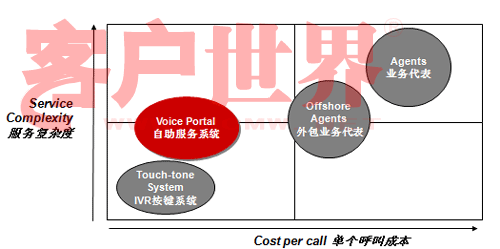 讓我們來看看這張圖。這張圖縱軸是服務的復雜度,橫軸是單位呼叫成本,傳統的IVR(觸鍵的語音IVR)和人工服務相比,服務的復雜度可就差多了。而Voice Portal的概念是用比較少的成本做更多的業(yè)務,從成本上講比原來的傳統的IVR可能成本稍微高一點點,但是和人工服務相比,無論是和單位自建呼叫中心座席比,還是和外包呼叫中心座席比,成本都有很大降低,但業(yè)務復雜度可以做得比傳統IVR復雜很多。我們承認,就提供服務的內容來講,Voice Portal今天仍然不能夠像人工那樣提供那么全面的服務,但是可以涵蓋很多服務內容,在這方面一是因為技術先進了,另一方面也在于引導。今天我看到越來越多的客戶已經開始有意識的推行自助服務形式。我前幾年去新加坡打出租,發(fā)現在新加坡有很多叫出租的車站,車站上有一個按鍵,按鍵上有一個編碼,說明你在什么位置,當你打通出租車客服的電話,你只要告訴這個編碼,他們就自然而然知道你在什么地方,并把要來接你的車車牌號通過語音報讀方式通知你。今天在中國也開始有這種形式了。昨天我沒有開車,也算是支持北京市每周少開一天車的號召,我打了出租,在和出租司機聊天的過程中,出租司機說現在油價很貴,他們有很強烈的需求不愿意掃馬路,他們也有一個出租車叫車電話,那個呼叫中心大概有上百個坐席,這個公司有一萬六千輛出租車在北京,由他們來進行搶答,搶答完之后你可以告訴說這個人在什么地方等,唯一不同的我們在自助化上還沒有做得那么到位,司機搶到了活還要給客戶打一個電話,不象新加坡完全是自助的,你只要按了那個鍵,系統就知道你在什么地方,當尋找到合適的車的時候,語音報讀你車牌號就行了。我和說出租車師傅,那你打電話成本不是增加了嗎,他一笑,增加打一個電話的成本怎么也比掃馬路強。大家可以看看呼叫中心多有用,自助服務能省多少錢。