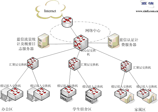 在網(wǎng)絡(luò)中心機(jī)房部署“藍(lán)信認(rèn)證計(jì)費(fèi)系統(tǒng)”,藍(lán)信認(rèn)證計(jì)費(fèi)系統(tǒng)除支持標(biāo)準(zhǔn)的RADIUS協(xié)議外,還支持領(lǐng)先的802.1x協(xié)議,通過與各接入層交換機(jī)的配合,實(shí)現(xiàn)了認(rèn)證管理功能。通過綁定帳號(hào)、IP、MAC地址等15元素,真正保證只有合法用戶才能通過認(rèn)證;對(duì)用戶進(jìn)行分級(jí)權(quán)限管理,可按信用度等級(jí)對(duì)用戶進(jìn)行劃分,方便了用戶的管理。此外,在網(wǎng)絡(luò)出口處部署藍(lán)信流量統(tǒng)計(jì)工具,通過與藍(lán)信認(rèn)證計(jì)費(fèi)系統(tǒng)的配合,實(shí)現(xiàn)對(duì)用戶按流量來(lái)計(jì)費(fèi),可以把用戶訪問流量按校內(nèi)校外、國(guó)內(nèi)國(guó)際來(lái)區(qū)別對(duì)待,并設(shè)置不同的費(fèi)率。同時(shí),還部署了藍(lán)信概要日志系統(tǒng),有效記錄了用戶的上網(wǎng)信息,并提供人性化的web客戶端,方便管理者進(jìn)行事后查詢,有效的控制了網(wǎng)絡(luò)的安全性。
