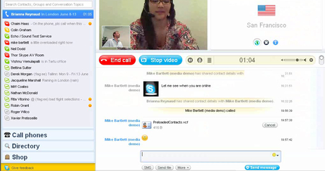 顯著的一個大改變是,軟件界面變成了全屏,而視頻窗口又占據(jù)了絕大部分版面。在視頻中還有“畫中畫”的功能,小的畫面可以任意移動?梢哉fskype從一部網(wǎng)絡(luò)電話,變成了一部網(wǎng)絡(luò)可視電話;蛘,好像感覺是在視頻聊天室中一樣。