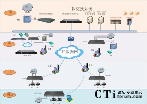 - 地州市分集團(tuán)放置的二級(jí)軟交換系統(tǒng),作為其管轄的縣(市)級(jí)分集團(tuán)和營(yíng)業(yè)廳的呼叫控制中心,管理和控制其管轄地區(qū)的IP電話(huà)終端設(shè)備。