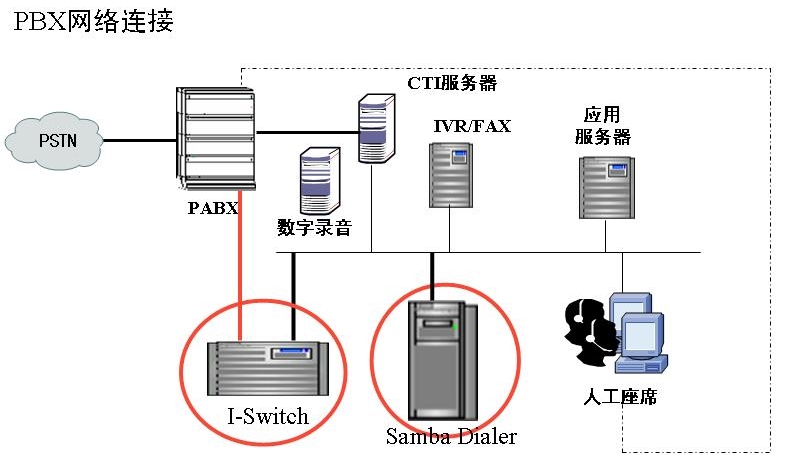 Samba Dialer和潤(rùn)迅通信哈里斯數(shù)字程控交換機(jī)利用ISDN PRI進(jìn)行匯接,共享現(xiàn)有話機(jī),大大保護(hù)了投資。Samba Dialer直接通過(guò)PRI進(jìn)行信令檢測(cè),不依賴程控交換機(jī)的CTI功能,這樣可以避免大量外撥電話對(duì)CTI資源的占用而影響呼入業(yè)務(wù)的運(yùn)作。另外,交換機(jī)的CTI接口一般不具備很高的穩(wěn)定性,Samba