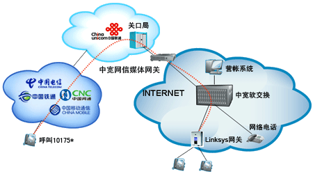 企業(yè)或個人自行從網站上成功申請“企業(yè)商務通”或“個人隨身行”業(yè)務后,通過101756*全國統(tǒng)一接入號結合中寬網信推薦的思科linksys網關或網絡電話使用,當外部對您申請的10175*號碼發(fā)起呼叫時,該呼叫通過中國聯通的線路將話務指向中寬網信的媒體網關,由中寬軟交換平臺將呼叫送至您指定的電話上。另外,當您使用該業(yè)務外呼時,可以選擇在被叫電話上顯示10175*或隱藏號碼。