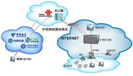 企業(yè)自行從網站上成功申請“企業(yè)商務通” 業(yè)務后,通過101756*全國統(tǒng)一接入號后結合中寬網信推薦的IPPBX,當外部對企業(yè)申請的10175*號碼發(fā)起呼叫時,該呼叫通過中國聯通的線路將話務指向中寬網信的媒體網關,由中寬軟交換平臺將呼叫送至指定的IP