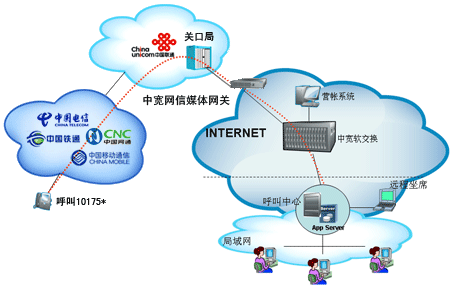 企業(yè)自行從網站上成功申請“企業(yè)商務通”業(yè)務后,通過101756*全國統(tǒng)一接入號結合呼叫中心,當外部對企業(yè)申請的10175*號碼發(fā)起呼叫時,該呼叫通過中國聯通的線路將話務指向中寬網信的媒體網關,由中寬軟交換平臺將呼叫送至指定的呼叫中心,由呼叫中心完成相應的服務。另外,當您使用該業(yè)務外呼時,可以選擇在被叫電話上顯示10175*或隱藏號碼。