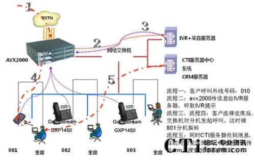 在方案中外線呼入IPPBX,IPPBX根據(jù)呼入路由指向特定rtsp號(hào)碼,rtsp根據(jù)配置引導(dǎo)IVR服務(wù)器開始播放語音,客戶根據(jù)語音提示按鍵轉(zhuǎn)接坐席、傳真或自動(dòng)語音應(yīng)答等;坐席接聽時(shí)同時(shí)屏幕彈出CRM中關(guān)于該來電號(hào)碼的相關(guān)信息,使坐席能做針對(duì)性的應(yīng)答和服務(wù),同時(shí)記錄報(bào)表數(shù)據(jù)供查詢。