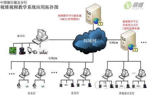 中國銀行湖北分行的視頻教學(xué)系統(tǒng)由服務(wù)器端和客戶端組成,服務(wù)器端軟件部署在省分行中心機(jī)房,配置2臺服務(wù)器,對于接受點(diǎn)超過5個(gè)的分支機(jī)構(gòu)配置二級轉(zhuǎn)發(fā)服務(wù)器,共支持全省各支行及支行內(nèi)多個(gè)客戶端同時(shí)在線,負(fù)責(zé)所有培訓(xùn)的召集、音視頻交互、加密等工作,各支行通過WEB方式即可實(shí)現(xiàn)客戶端軟件的自動(dòng)安裝與升級,輕松實(shí)現(xiàn)實(shí)現(xiàn)省分行以及各支行共77余個(gè)接受點(diǎn)的高清音視頻視頻教學(xué)。同時(shí)為中國銀行湖北分行的視頻教學(xué)系統(tǒng)配置異構(gòu)兼容模塊,支持與其他視頻會(huì)議及軟、硬件視頻教學(xué)系統(tǒng)無縫融合,避免重復(fù)投資造成的浪費(fèi)。網(wǎng)絡(luò)拓?fù)鋱D如下: