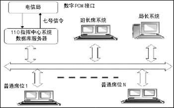 系統(tǒng)由以下部分組成:CTI服務(wù)器、接警席位系統(tǒng)、班長(zhǎng)席位系統(tǒng)、局長(zhǎng)席位系統(tǒng)。各部分系統(tǒng)可根據(jù)實(shí)際需求任意組合,各個(gè)部分充分考慮到開發(fā)的實(shí)用性、可靠性、先進(jìn)性和開放性,能夠?qū)④浖S護(hù)降到最小程度,這樣的設(shè)計(jì)可以讓用戶能夠改動(dòng)硬件和數(shù)據(jù)庫(kù),卻不用將軟件整體更換,保證了用戶的投資。其結(jié)構(gòu)如圖2所示。