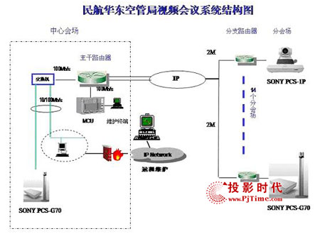 為了建成“具有華東特色,符合總局要求”的視頻會議系統(tǒng),空管局領導經(jīng)過嚴格的考察和甄選后,最后采用了Sony的視頻會議系統(tǒng)解決方案,包括5臺PCS-G70和10臺PCS-1P。整個項目運行在民航數(shù)據(jù)網(wǎng)(ATM網(wǎng))的環(huán)境下,共有24個節(jié)點,設備分布呈星型結構。