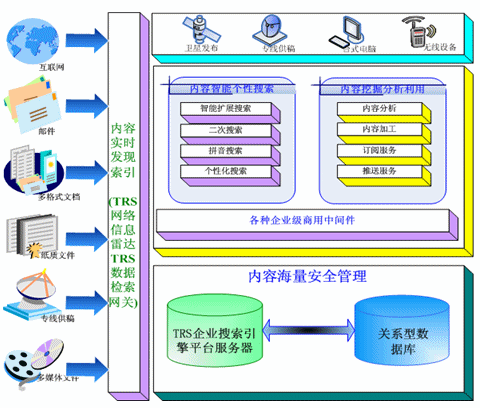 TRS公司推出的企業(yè)搜索引擎解決方案,利用TRS公司多年來自主開發(fā)的TRS Database Server作為企業(yè)搜索引擎服務(wù)的平臺?梢詫㈦娦牌髽I(yè)內(nèi)外部多種格式、多種介質(zhì)形態(tài)、多種存儲方式的內(nèi)容信息,以實時的方式將這些信息進行索引。并且在索引的過程中力求能夠做到準確,并配合以相關(guān)智能語言技術(shù)做信息的去重、自動標引等能力。其框架如圖:
