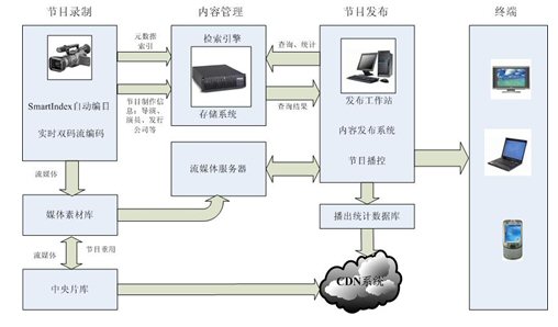 節(jié)目制作平臺主要負(fù)責(zé)節(jié)目的采編,接收節(jié)目源的數(shù)字視頻信號和模擬視頻信號進(jìn)行實時/超實時的轉(zhuǎn)碼,并同時進(jìn)行自動編目、歸檔,滿足系統(tǒng)不同應(yīng)用的要求。另外,各資源建設(shè)成員單位或各地、州、市遠(yuǎn)程辦按照省遠(yuǎn)程辦的統(tǒng)一部署,加工各自類別的課件,采用人工傳送介質(zhì)或利用VPN實現(xiàn)專網(wǎng)的方式送交到資源庫系統(tǒng)中,實施統(tǒng)一的存儲和管理。