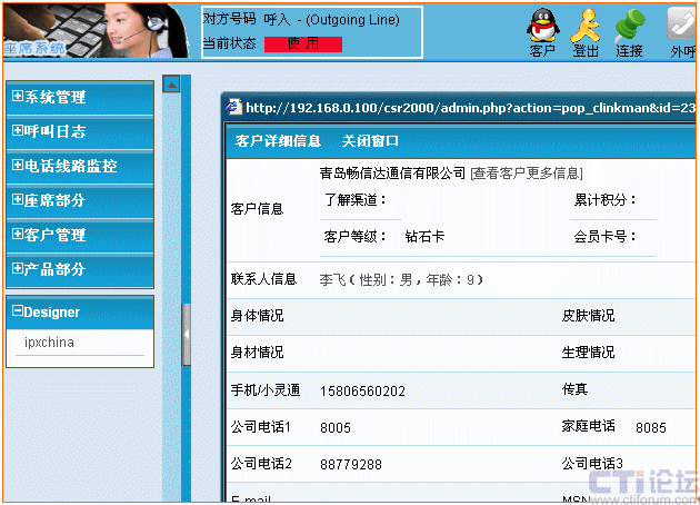 當(dāng)客戶來電轉(zhuǎn)接人工服務(wù)時(shí),自動(dòng)彈出信息登記窗口并根據(jù)來電號(hào)碼檢查客戶資料庫(kù)中是否有該客戶的數(shù)據(jù)。如客戶的名稱、地址、聯(lián)系電話、身體狀況、膚色、以往的咨詢、投訴等記錄信息。以及來電日期、時(shí)間、受理人等;使座席人員一目了然,第一時(shí)間了解來電的相關(guān)信息。