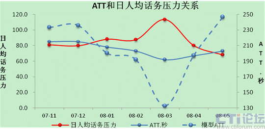 若ATT只受話務(wù)壓力影響,兩者關(guān)系應(yīng)出現(xiàn)下圖虛線描述的模型ATT形狀,而事實ATT的波幅相對小很多,說明ATT還受到其它諸多因素的制約。(圖1)