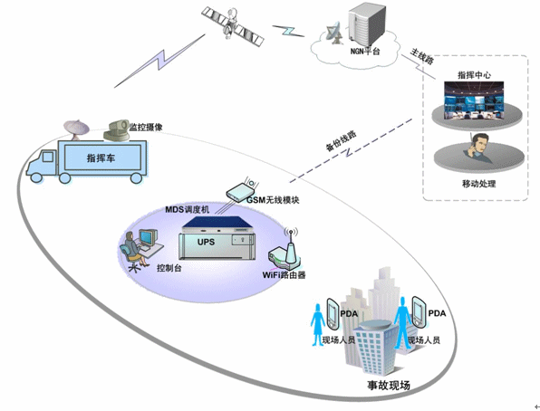 MDS調(diào)度機(jī)通過(guò)衛(wèi)星道與政府的NGN平臺(tái)對(duì)接,實(shí)現(xiàn)與整個(gè)城市的通信系統(tǒng)對(duì)接;并通過(guò)GSM、CDMA備份線路,實(shí)現(xiàn)多通信通道的實(shí)時(shí)切換,選擇最好的路由進(jìn)行通信。MDS調(diào)度機(jī)負(fù)責(zé)語(yǔ)音通訊、調(diào)度作業(yè)和指令消息轉(zhuǎn)發(fā);應(yīng)急指揮車配備調(diào)度機(jī)、調(diào)度臺(tái)、移動(dòng)調(diào)度終端、衛(wèi)星接收設(shè)備、監(jiān)控視頻設(shè)備及其他設(shè)備。所有的調(diào)度語(yǔ)音終端都可與MDS調(diào)度系統(tǒng)對(duì)接,實(shí)現(xiàn)調(diào)度功能及與其他的通信終端進(jìn)行通信。