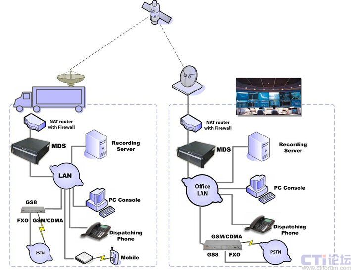 Zed-3的車載調(diào)度系統(tǒng)支持多種接口,通過無線網(wǎng)關(guān)提供的GSM、CDMA或模擬中繼端口,可以實(shí)現(xiàn)與固定電話、手機(jī)等外部電話的互通。即使在現(xiàn)場沒有任何可用的外線資源,例如沒有模擬電話接口,手機(jī)卡沒有信號(hào),也仍然可以通過衛(wèi)星鏈路將呼叫連接到指揮中心的網(wǎng)關(guān)設(shè)備再落地,最大可能的保證現(xiàn)場調(diào)度系統(tǒng)與外部電話的通信。