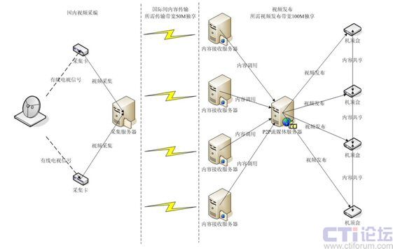 原力P2P跨區(qū)域傳輸系統(tǒng):以P2P加速的方式,將采集到的視頻內(nèi)容從國(guó)內(nèi)發(fā)往國(guó)外?筛鶕(jù)特定時(shí)間的設(shè)定,在有效傳輸時(shí)間內(nèi)將采集到的視頻內(nèi)容,在互聯(lián)網(wǎng)上直接發(fā)網(wǎng)國(guó)外內(nèi)容接收服務(wù)器。     內(nèi)容接收:此計(jì)算機(jī)直接接入國(guó)際互聯(lián)網(wǎng),在到達(dá)特定時(shí)間范圍后,響應(yīng)國(guó)內(nèi)的視頻傳輸請(qǐng)求。接受的視頻內(nèi)容在此處形成分流,需要即使播放的內(nèi)容將直接提供給P2P流媒體發(fā)布系統(tǒng)進(jìn)行用戶的P2P發(fā)布;需要存儲(chǔ)的點(diǎn)播文件和錄制的直播文件,直接存儲(chǔ)在存儲(chǔ)單元中。