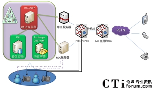 Office Communications Server 使用SIP 協(xié)議連接到PHILIPS Is3030交換機。然后通過微軟演示中的PBX再連接到本地的PSTN.