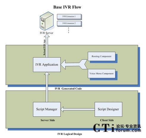 應(yīng)用Agent Script Designer 設(shè)計一個 IVR 應(yīng)用腳本, 發(fā)布到 Script Manager進行管理, 透過Script Manager, 可以讓IVR 應(yīng)用腳本生效并產(chǎn)生一組可以部署到 IVR Server 的 IVR Application, IVR Application 運用 IVR二個核心組件: Routing Component 及 Voice Menu Component, 執(zhí)行語音菜單的流程及派 Call 的機制。
