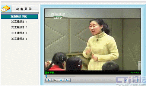 先在直播系統(tǒng)里啟動(dòng)設(shè)置好的01號(hào)頻道,其他教師就可以在各自辦公室通過(guò)計(jì)算機(jī)網(wǎng)絡(luò)觀看遠(yuǎn)教節(jié)目,不需淘神費(fèi)力地到專門(mén)的接收室了。如下圖: