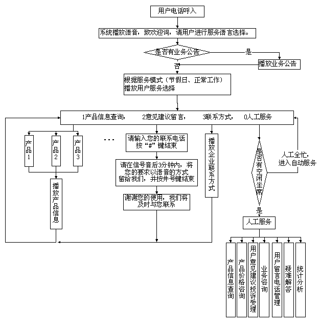 通過電腦語音引導,提示按鍵的方式,用戶通過電話、傳真等可自動獲取企業(yè)的相關信息,如公司介紹、聯(lián)系方式、產(chǎn)品信息介紹等,以及對產(chǎn)品的投訴建議,留言,留聯(lián)系電話等;