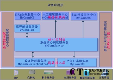系統(tǒng)平臺(tái)層:MyComm是一個(gè)基于硬件支撐平臺(tái)之上的CTI應(yīng)用開發(fā)中間件。對(duì)下屏蔽了復(fù)雜的硬件通控制;對(duì)上,簡(jiǎn)化和提高業(yè)務(wù)應(yīng)用的實(shí)際、開發(fā)和應(yīng)用