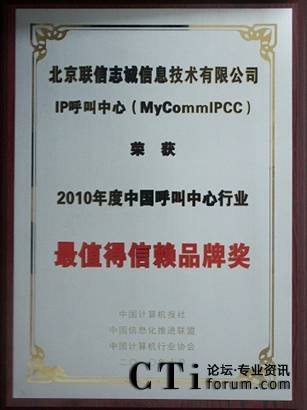 CTI論壇(ctiforum)11月1日消息(記者 潘婷婷):近日,在國家信息化專家咨詢委員會(huì)的指導(dǎo)下,作為中國信息化發(fā)展重要推動(dòng)力量的中國計(jì)算機(jī)報(bào)社、中國計(jì)算機(jī)行業(yè)協(xié)會(huì)、中國信息化推進(jìn)聯(lián)盟等國家級(jí)權(quán)威媒體及國家信息化領(lǐng)域一級(jí)權(quán)威機(jī)構(gòu),共同組織開展“2010中國行業(yè)信息化讀者選擇獎(jiǎng)評(píng)選”,重點(diǎn)展示信息化在行業(yè)應(yīng)用中的優(yōu)秀應(yīng)用案例、產(chǎn)品及解決方案。由中國計(jì)算機(jī)報(bào)社組織業(yè)內(nèi)專家,在經(jīng)過歷時(shí)3個(gè)月的產(chǎn)品征集、方案論證、專家評(píng)審后,北京聯(lián)信志誠信息技術(shù)有限公司(簡稱MyComm公司),其核心產(chǎn)品MyCommIPCC獨(dú)占2010年中國呼叫中心行業(yè)最值得信賴品牌獎(jiǎng)。