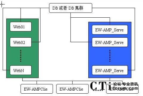 EW-AMP中間件在應用中,可以配置多臺EW-AMP Server服務器由EW-AMP應用集群技術(shù)組成EW-AMP Server集群,也可以配置多臺客戶的Web應用(如CRM,MIS等)由EW-AMP