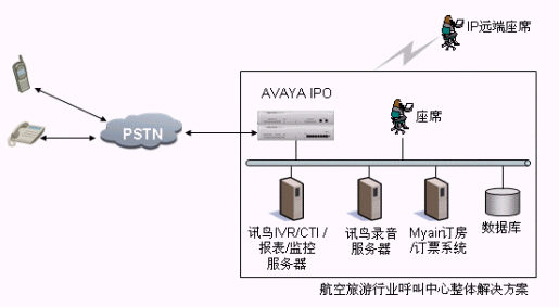 本方案采用Avaya IP office系列交換機(jī),通過(guò)訊鳥(niǎo)中間件控制整個(gè)呼叫中心的電話呼入、呼出。它支持多種聯(lián)絡(luò)渠道,包括語(yǔ)音、交互式自動(dòng)語(yǔ)音應(yīng)答(IVR)、傳真、電子郵件、web、短消息等,同時(shí)利用Myair航空管理系統(tǒng)來(lái)完成整個(gè)業(yè)務(wù)流程,廣泛適用于航空旅游服務(wù)公司訂房、訂票呼叫中心的業(yè)務(wù)需求。