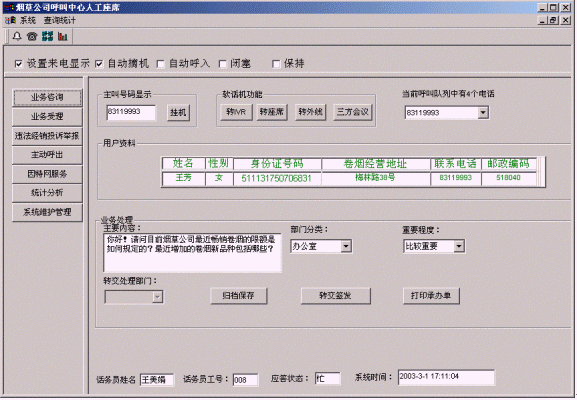客戶(hù)打入電話(huà)后,當(dāng)系統(tǒng)的自動(dòng)語(yǔ)音應(yīng)答子系統(tǒng)無(wú)法解決客戶(hù)問(wèn)題時(shí),客戶(hù)可選擇人工服務(wù),由企業(yè)客戶(hù)服務(wù)代表直接接聽(tīng)客戶(hù)電話(huà),處理并解決客戶(hù)問(wèn)題。此時(shí)客戶(hù)同座席話(huà)務(wù)人員直接溝通,并同時(shí)記錄下該客戶(hù)的聯(lián)系方式,將相關(guān)數(shù)據(jù)添加入系統(tǒng)數(shù)據(jù)庫(kù);也可以在數(shù)據(jù)庫(kù)的支持下回答接受查詢(xún)卷煙/價(jià)格/限額/新品種、卷煙經(jīng)營(yíng)規(guī)范制度/卷煙專(zhuān)賣(mài)政策法規(guī)咨詢(xún)、通報(bào)最近暢銷(xiāo)卷煙的限額情況/通報(bào)最近增加的新品種/煙草公司召集的活動(dòng)通知、投訴和舉報(bào)違法經(jīng)銷(xiāo)行為、卷煙預(yù)訂、電話(huà)訪(fǎng)銷(xiāo)、滿(mǎn)意度調(diào)查等。