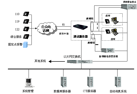 。2).若屬119、122報警電話,則市局指揮中心接警后可將報警信息通過計算機網絡分別傳送至相應的消防大隊或交警大隊,由責任大隊分別實施處警。由于本方案在消防大隊和交警大隊分別配置遠程終端,則119、122報警電話可實現二級接警,即市局和消防大隊或交警大隊同時接警,正常情況下市局指揮中心只起轉發(fā)與監(jiān)控的作用;若大隊因設備故障或其它原因沒有接警,則市局可正常接處警,可直接調度指揮相關人員或單位出警,保證接處警工作正常進行。消防大隊和交警大隊接處警過程與市局相同,不再敘述。