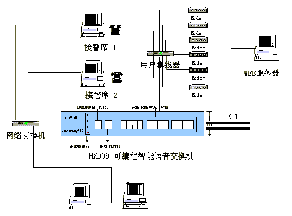 本系統以HXD09型可編程智能語音交換機為核心完成智能交換,內置語音資源。