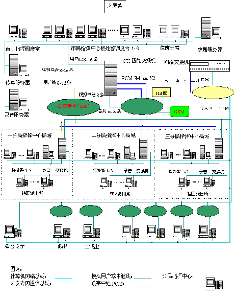 - 樹立大網絡概念:采用先進的通訊、計算機網絡技術(采用CTI可編程交換技術),利用現有的通信資源,實現市局指揮中心與消防大隊、交警大隊、各派出所的計算機網絡及相關領導辦公室計算機大聯網;形成全市范圍內110、119、122有線、無線全方位立體調度語音通道大網。
