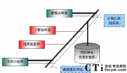 通過對消防安全監(jiān)控指揮中心業(yè)務(wù)的分析,引進(jìn)先進(jìn)的數(shù)據(jù)通信網(wǎng)絡(luò)和語音通訊網(wǎng)絡(luò),我們可以將未來的消防業(yè)務(wù)層次抽象地概括為四層(如圖所示):管理決策層、火警監(jiān)測層、指揮調(diào)度層和作戰(zhàn)行動層。與管理決策層對應(yīng)的組織機(jī)構(gòu)為消防通信指揮中心;與火警檢測層、指揮調(diào)度層對應(yīng)包括消防指揮中心的接處警子系統(tǒng)、指揮調(diào)度等子系統(tǒng);與作戰(zhàn)行動層對應(yīng)的組織機(jī)構(gòu)為消防站(消防隊)和消防車及消防隊員。