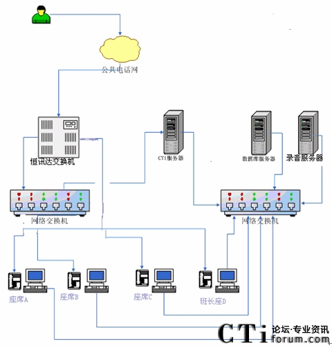 根據(jù)以上業(yè)務設計框架,我們確定了客服中心搭建時所需要的設備,系統(tǒng)的網(wǎng)絡拓撲結(jié)構圖如下:
