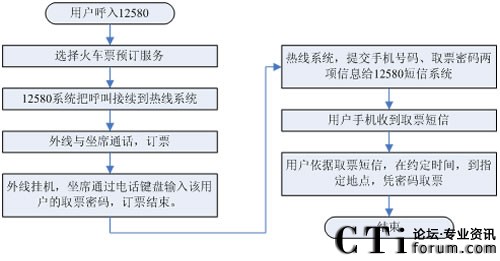 1、用戶通過手機電話訂票,首先進入12580系統(tǒng),在12580系統(tǒng)中選擇訂票服務,12580系統(tǒng)通過與訂票熱線的語音線路,把用戶接續(xù)到訂票熱線系統(tǒng)。
