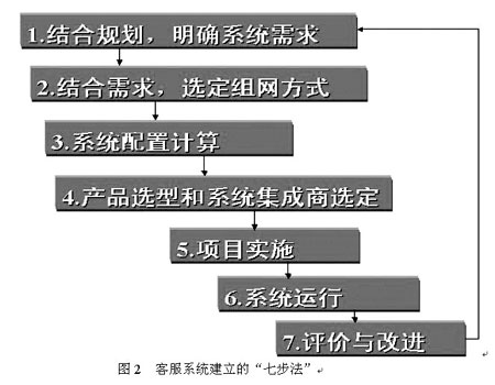 在規(guī)劃了呼叫中心戰(zhàn)略、客服組織架構(gòu)、客服流程與客服績效考評之后,呼叫中心系統(tǒng)的建設(shè)就有了戰(zhàn)略層面的規(guī)劃和運(yùn)營管理層面的指導(dǎo),而對戰(zhàn)略管理和運(yùn)營管理方面的支持則有賴于客服系統(tǒng)的建立。在戰(zhàn)略管理和運(yùn)營管理指導(dǎo)下的客服系統(tǒng)如何具體建立呢?下面分七個(gè)步驟來分別說明: