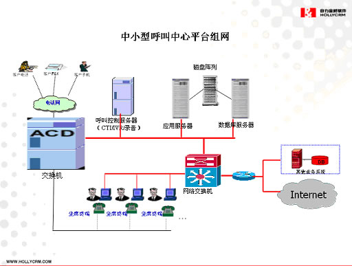 中小型呼叫中心平臺(tái)具有較強(qiáng)的擴(kuò)展能力,可以支持100座席左右的呼叫中心,每天的呼叫處理量在5000~10000人/次。當(dāng)您希望建設(shè)一個(gè)中小規(guī)模、成本相對(duì)低廉、實(shí)施方便、快速、配置靈活的呼叫中心可以考慮采用HOLLYCRM中小型呼叫中心解決方案。