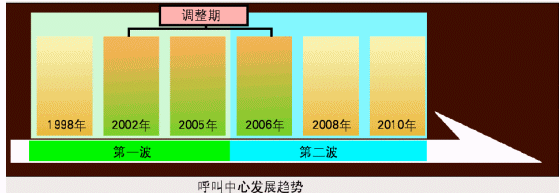 在合力金橋軟件公司的副總裁盧毅看來,1998年以前是呼叫中心在中國市場(chǎng)的導(dǎo)入期,1998~2005年第一波呼叫中心的建設(shè)期,直接促成了整個(gè)市場(chǎng)的擴(kuò)大和呼叫中心座席數(shù)的大幅增加;在2006年~2010年,由于受到中國加入WTO、2008年北京舉辦奧運(yùn)會(huì)、2010年上海舉辦世界博覽會(huì)等社會(huì)政治、經(jīng)濟(jì)事件的推動(dòng),將會(huì)出現(xiàn)第二波的呼叫中心建設(shè)風(fēng)潮;而從2002年~2006年中期是個(gè)調(diào)整期,第一波的呼叫中心建設(shè)此時(shí)進(jìn)入運(yùn)營期和消化期,同時(shí)為第二波的建設(shè)應(yīng)用積蓄力量。